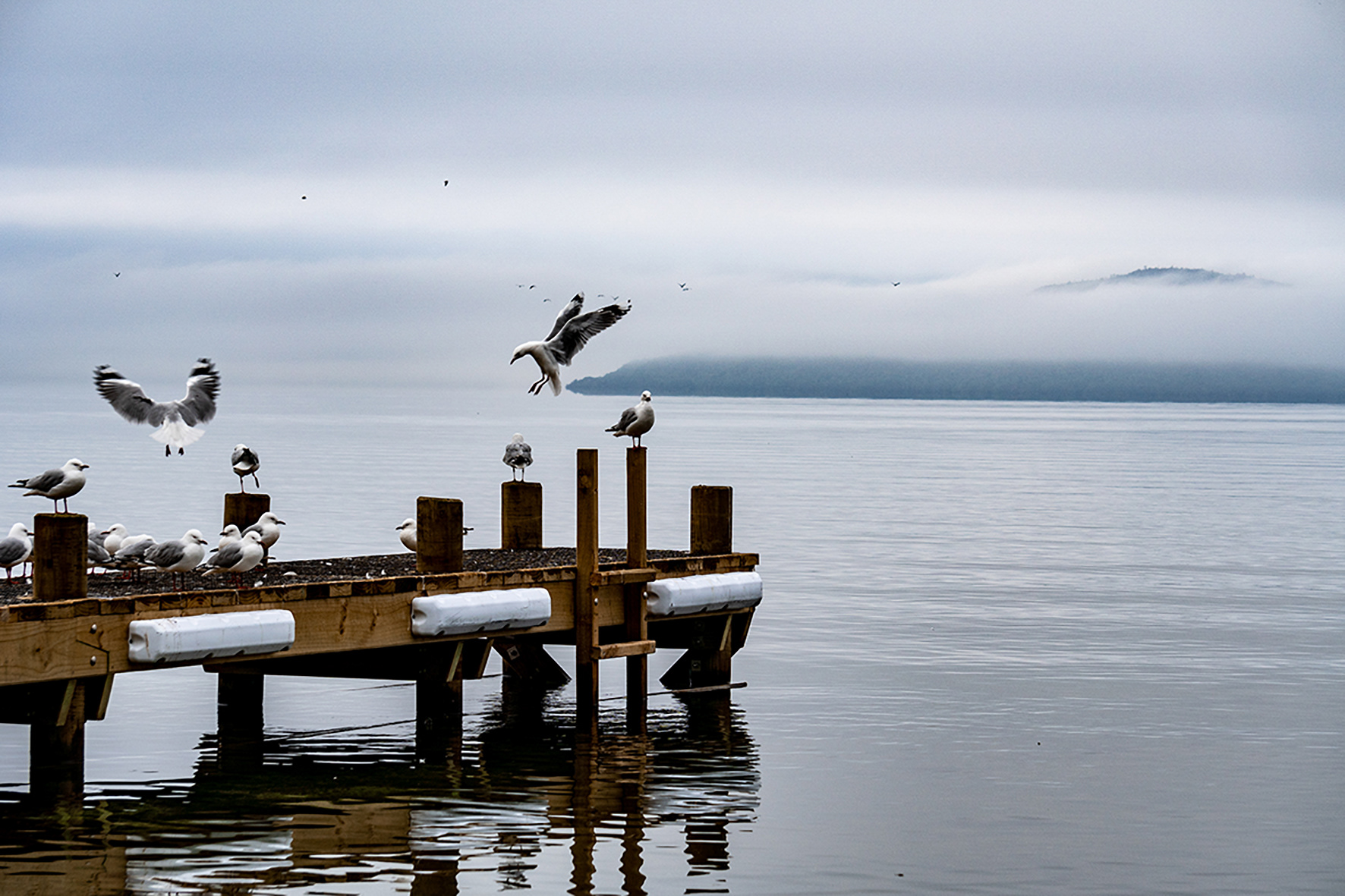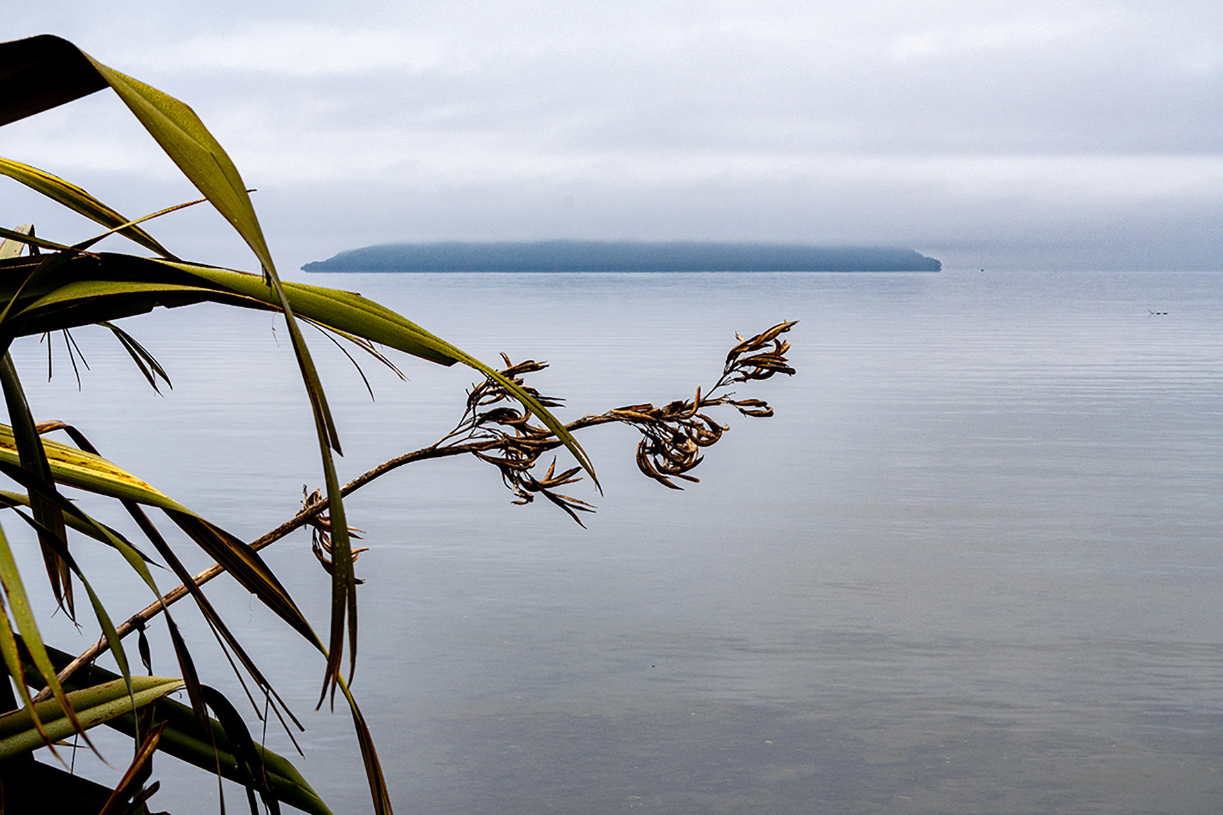 LAKE ROTORUA FLAX WITH HINEMOA IN MIST